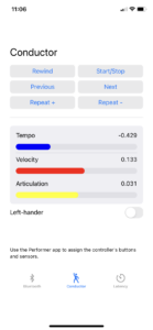 It is the Espressivo application’s responsibility to assign input elements to musical elements. All settings and changes are propagated back to the MusicalConductor app. In our case, Button 2 is assigned the Start/Stop function and a rotation around the X-axis is used to control the tempo.